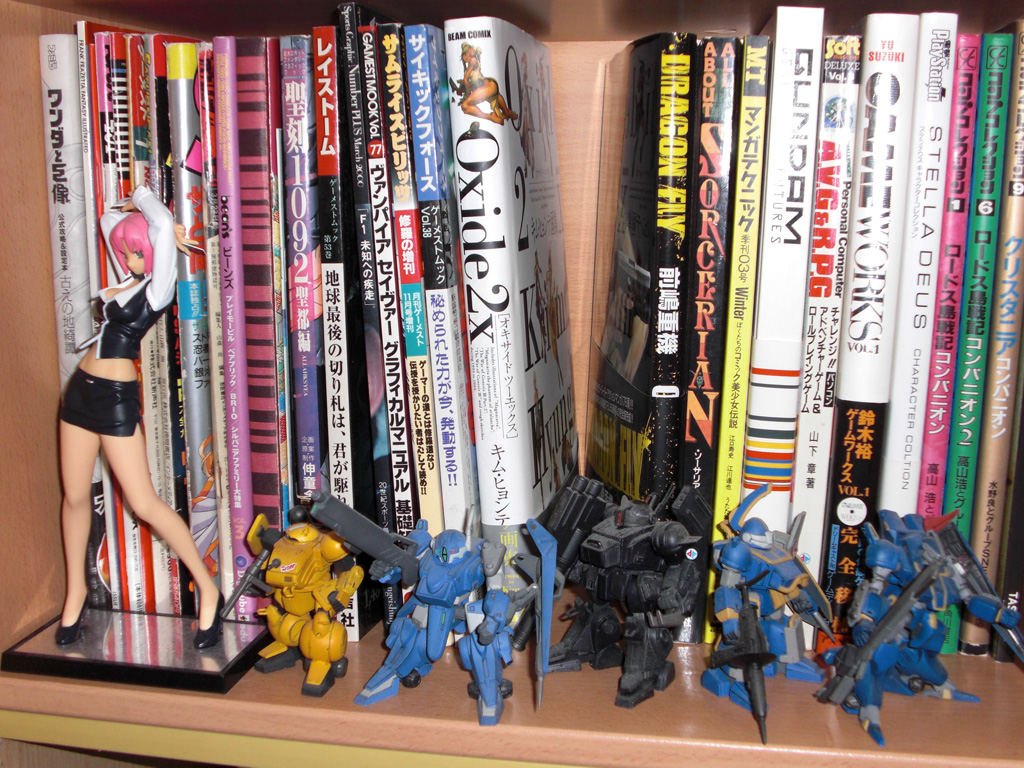 部屋の本棚の一角。左のデカいギャルは霊です。大嘘です。